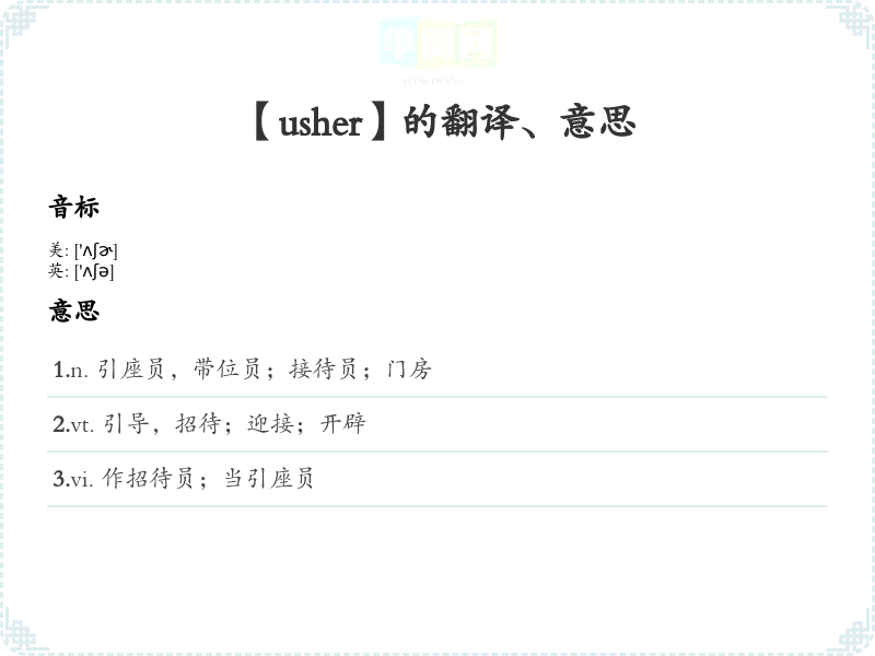 - 字面意思:Usher 是一个动词,字面意思是“引导”或“带领”。它通常指引导某人进入某个地方或引导某事的开始。