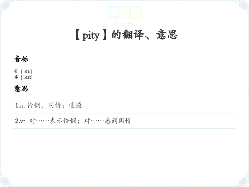 - 字面意思: "pity" 是指对他人不幸、痛苦或困难的同情和怜悯。其定义为对他人遭遇的不幸表示关心和同情。
