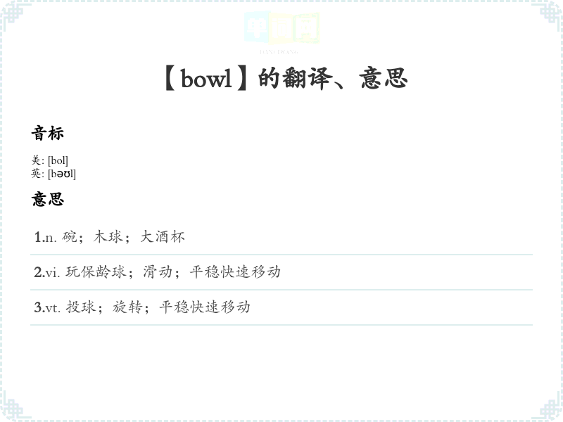 “Bowl” 是一个名词,通常指一种圆形的器皿,通常用来盛放食物、液体或其他物品。它也可以作为动词,表示用碗盛装或投球(如在保龄球中)。 - 词性: