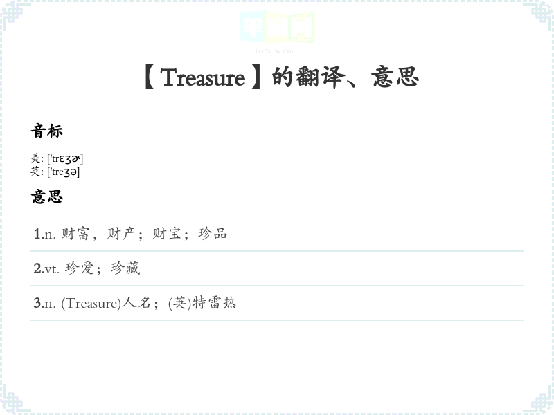 - 字面意思:Treasure 指的是珍贵的物品,如金银珠宝,或是被高度重视的东西,可以是物质的也可以是非物质的(如友谊、记忆等)。