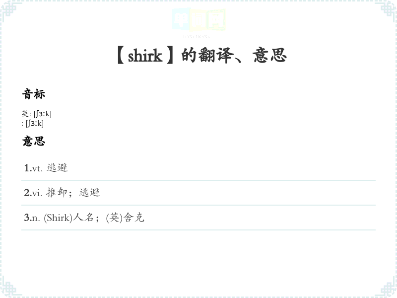 - 谐音联想记忆:可以联想“shirk”与“shirk off”(甩掉,逃避),帮助记忆其含义。