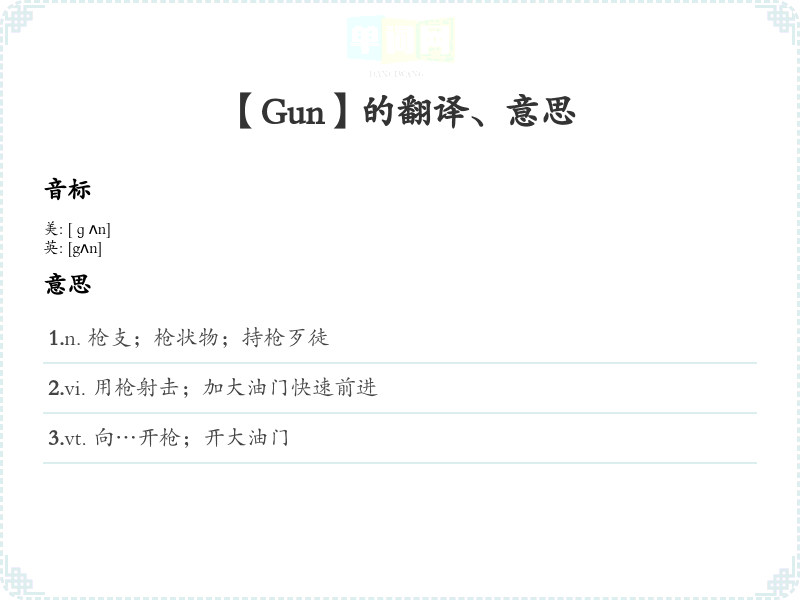 - 音标记忆法:Gun 的发音为 /ɡʌn/,可以通过音节拆分,强调其发音的韵律,帮助记忆。