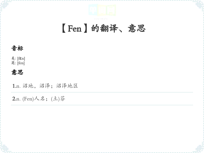 - Fen的词根“fen”表示湿地,可以联想到与水、湿润相关的词汇,如“wetland”(湿地)和“marsh”(沼泽)。通过记住“fen”与水的联系,有助于加深对其意义的理解。