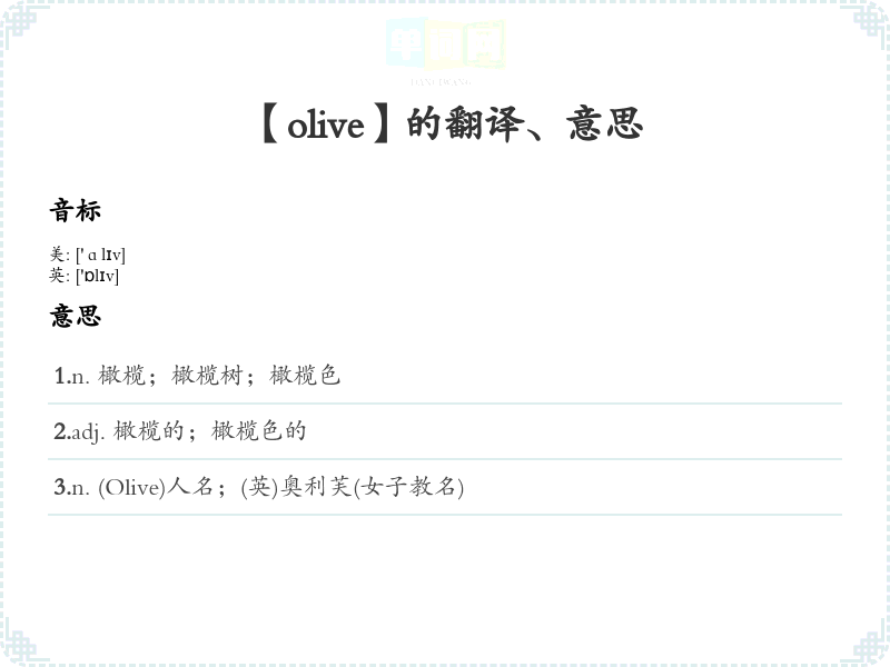 2.adj. 橄榄的;橄榄色的 3.n. (Olive)人名;(英)奥利芙(女子教名)