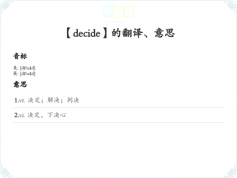 通过以上方法和信息,你可以更全面地理解和使用“decide”这个单词。