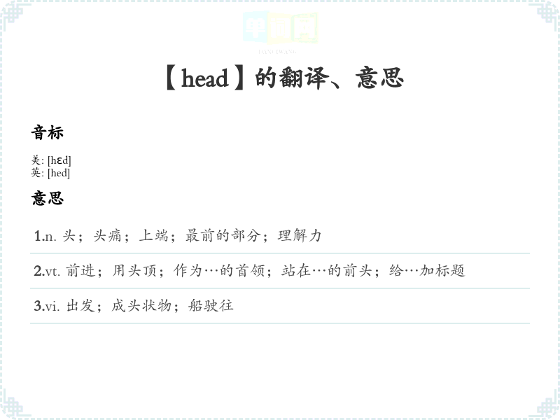 "Head" 可以作为名词和动词。- 名词(n.):指身体的部分或某事物的最上面部分。