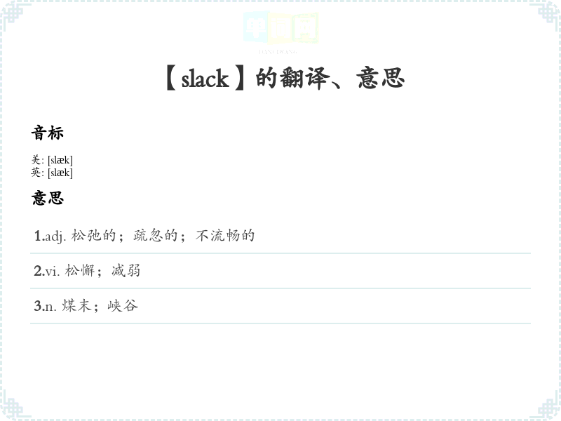 5.adv. 马虎地;缓慢地 6.n. (Slack)人名;(英)斯莱克
