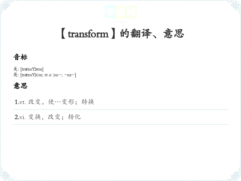 - 音标记忆法:/træns'fɔrm/。可以通过反复朗读该音标,并尝试拼读其他相似的单词来加深记忆。