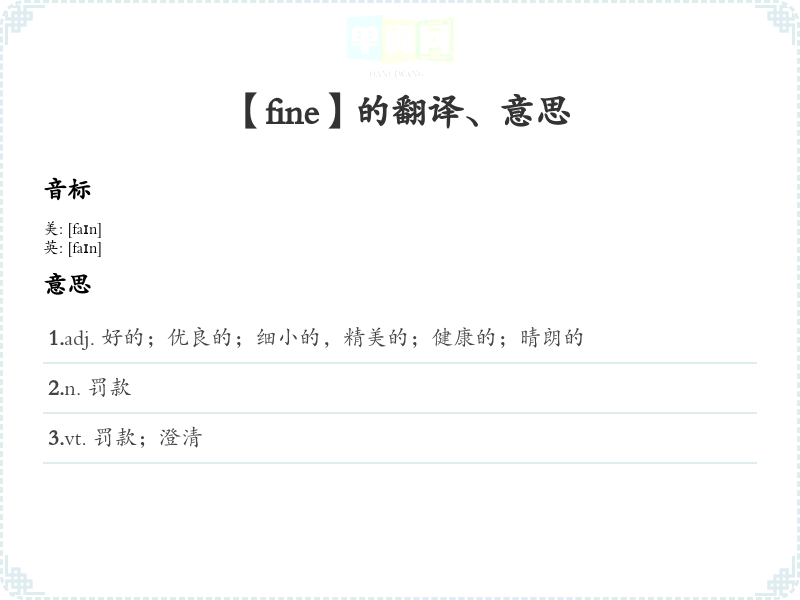 "fine" 的字面意思是“好的”、“精致的”、“纤细的”,可以表示某事物的质量、状态或外观的优良。 - 词性: