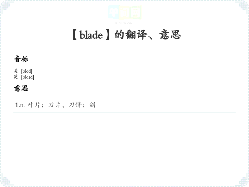 - 谐音联想记忆:将“blade”联想为“白的”,想象一把锋利的白色刀刃,加深对词义的理解。