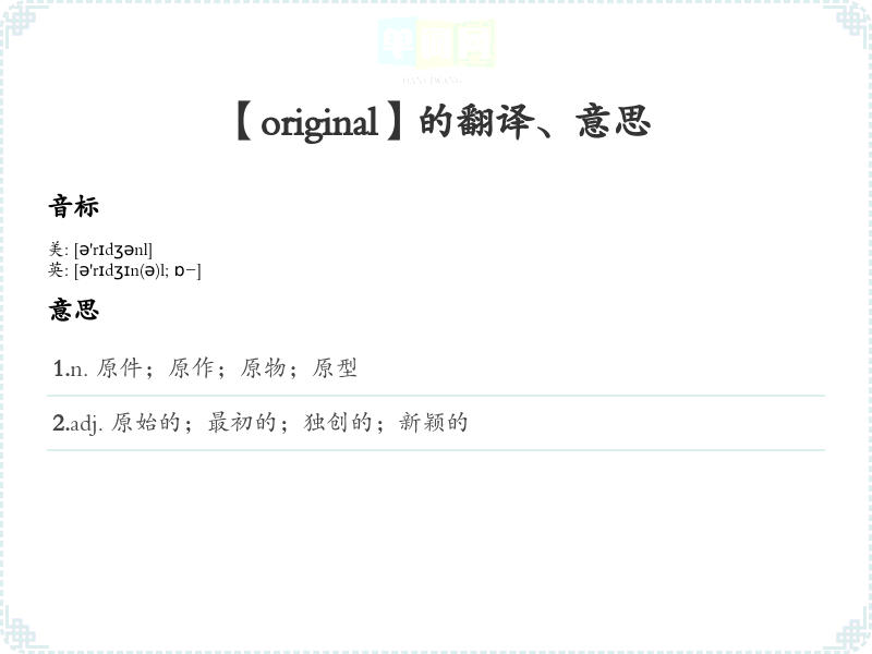 - "original" 的音标为 /əˈrɪdʒ.ɪ.nəl/。可以将其分为“o-rig-in-al”,每个音节都可以想象成一个具体的事物,比如“o”代表“起始”, “rig”代表“构建”,以此类推。