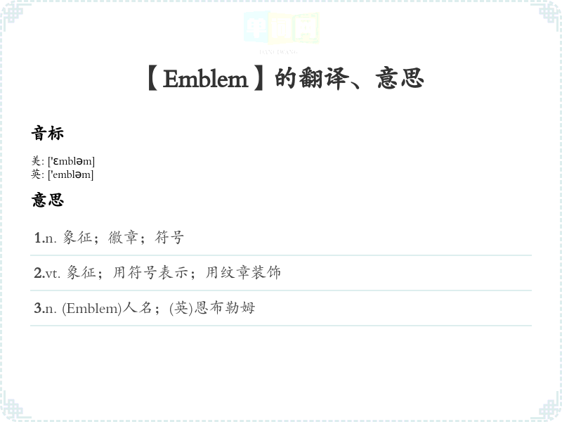 - 字面意思:Emblem 是指一种象征或标志,通常用于代表某一特定的理念、群体或国家。其定义为“一个象征性的标志或图案,通常用于表示某种理念或身份”。