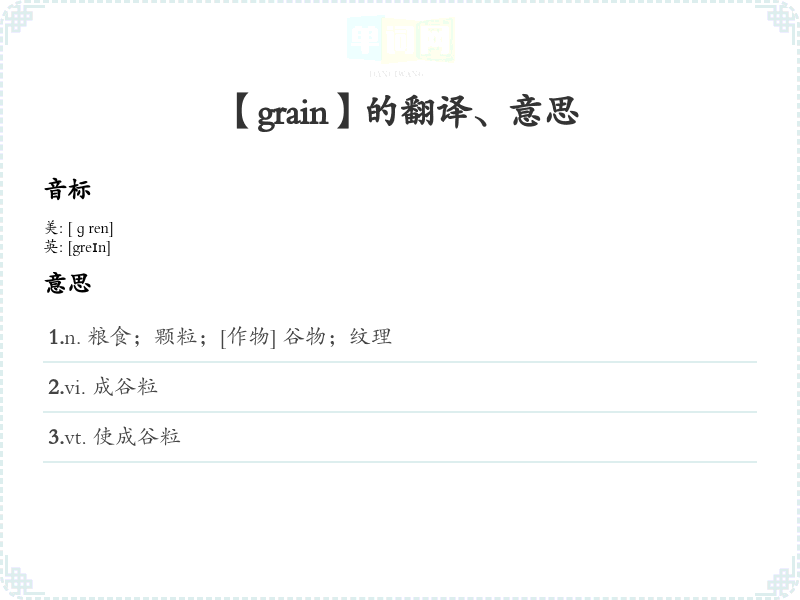 - 音标记忆法:学*“grain”的发音 /ɡreɪn/,可通过重复发音来加深记忆。可以尝试将其与“gain”相联系,意义上的“获得”与“谷物”的重要性联系起来。