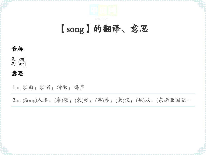学*“song”的发音为 /sɔːŋ/,可以通过听音频和跟读来加深记忆。 -