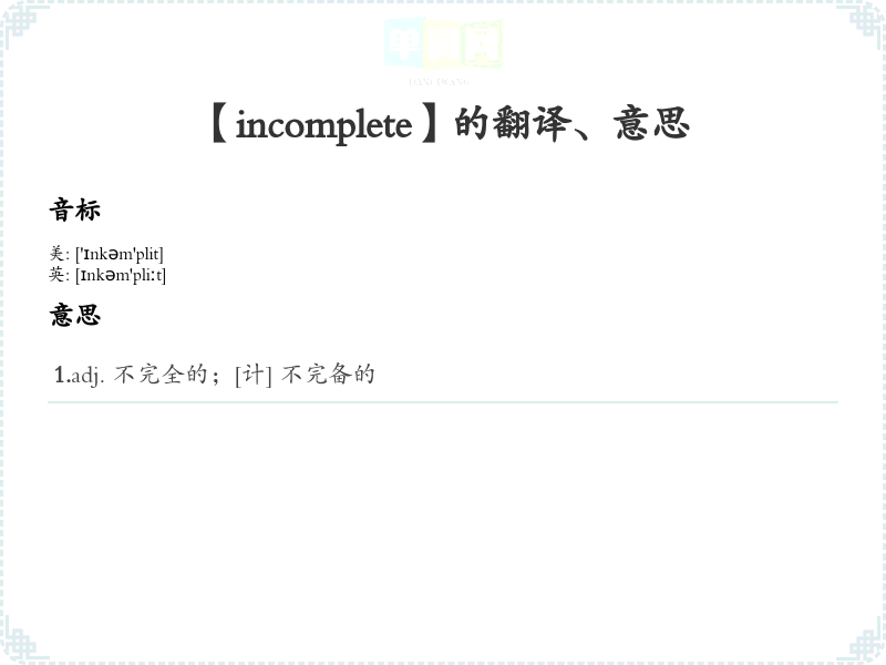 - 词根记忆法:记住 "in-"(否定)和 "complete"(完整),理解其组合形成了“不完整”的含义。