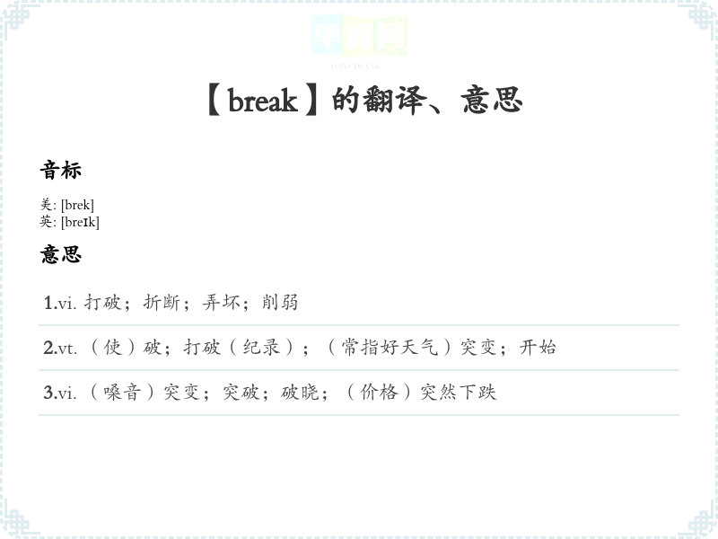 这种分析方法可以帮助学*者更深入地理解并有效使用“break”这个单词。