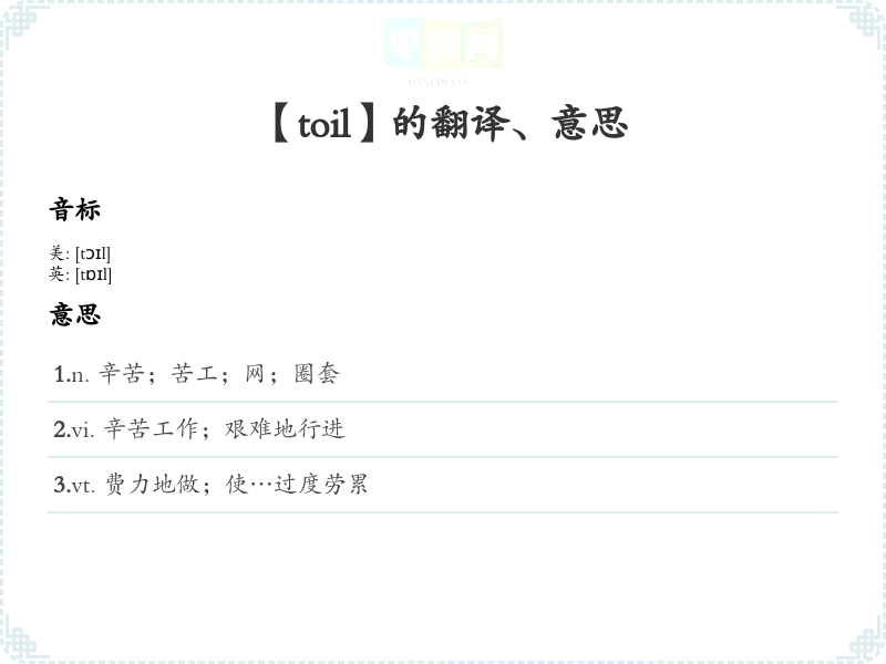 词根记忆法:将“toil”与“疲惫、努力”的相关概念联想,比如“toil = toil and trouble”(辛苦与麻烦)。