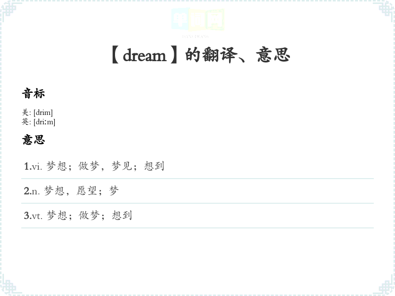 通过这些分析,可以更全面地理解和运用 "dream" 这个单词。