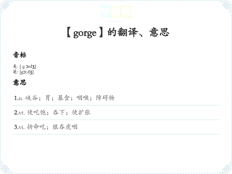 谐音联想记忆:可以将gorge联想为“过量吃”的感觉,想象自己在“gorge”(喉咙)里塞满食物。