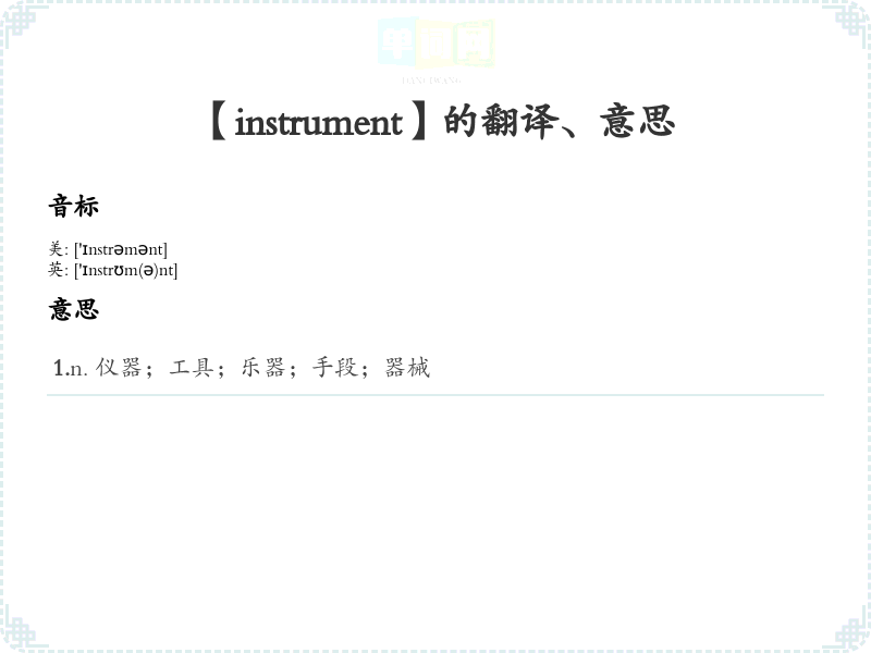 - 记住“instrument”与“structure”(结构)相关联,帮助记忆其含义和用法。