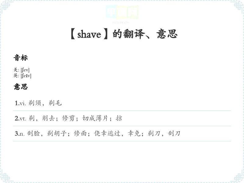 2.vt. 剃,削去;修剪;切成薄片;掠 3.n. 刮脸,剃胡子;修面;侥幸逃过,幸免;剃刀,刮刀