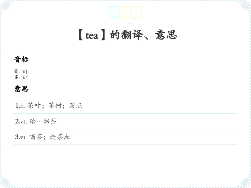 - 谐音联想记忆:可以联想“tea”和“天”谐音,想象在阳光下喝茶的场景,增强记忆。