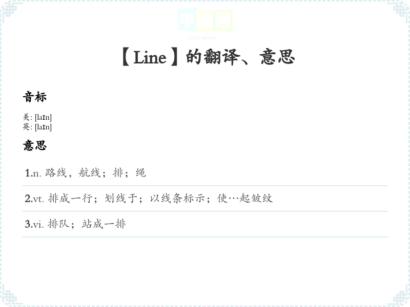 “Line” 的字面含义是“线”,指的是一个极细的、长而窄的形状,通常是直的,也可以指连接两个点的路径。 - 词性: