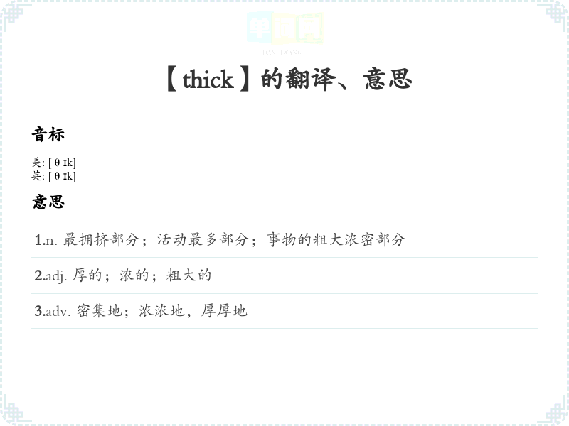- 在牛津和美国的教材中,"thick" 也常用于小学及中学的阅读理解和词汇练*中。