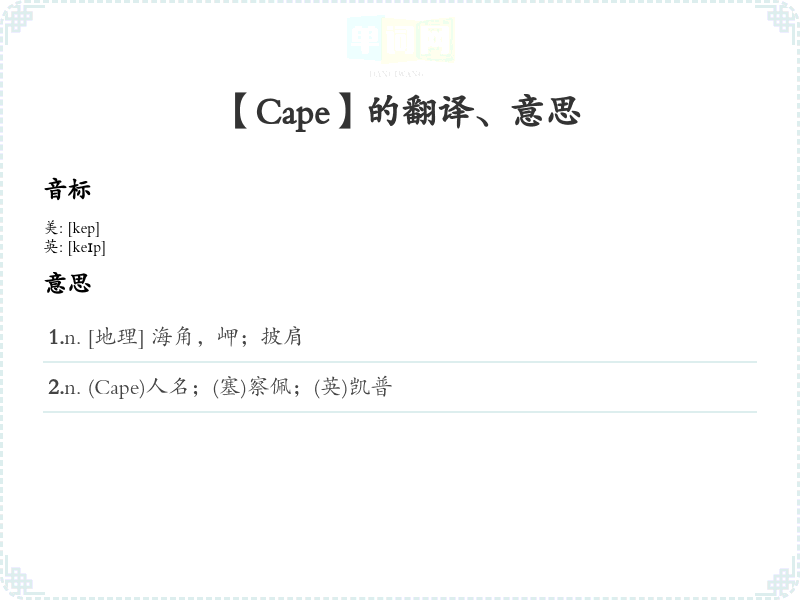 词源分析:Cape 源自拉丁语“cappa”,意指“斗篷,披肩”。这个词在古法语中演变为“cape”,与现代英语中的用法相似。