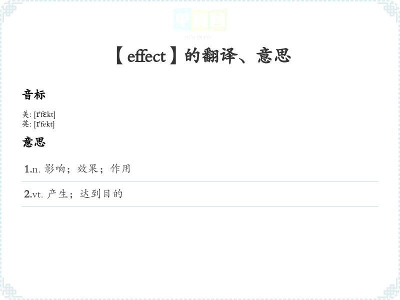- 谐音联想记忆:可以联想“effect”与“效果”的发音相似,帮助记忆。