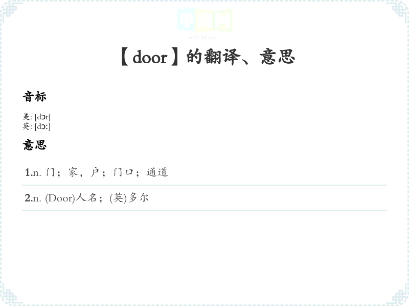 - 音标记忆法:/dɔːr/,可以通过分解为“do”(做)+“or”(或)来记忆,想象打开一扇门是做出选择的过程。