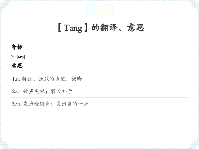 - 字面意思:Tang是一个名词,通常指一种缠绕的东西,特别是指*的一个朝代(18-907年)或指某种特定的调味料(如糖醋)。