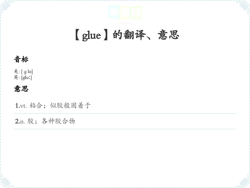 - 记忆法:通过反复朗读“glue”的音节,结合其含义,帮助记住这个单词。