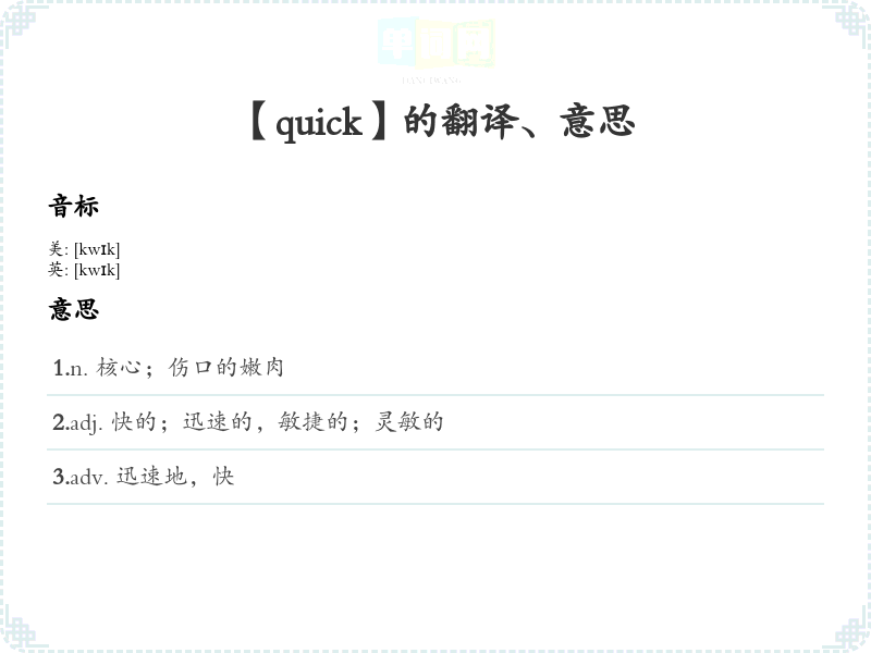 - 谐音联想记忆:可以联想“quick”与“快”在中文中的发音相似,帮助记忆。