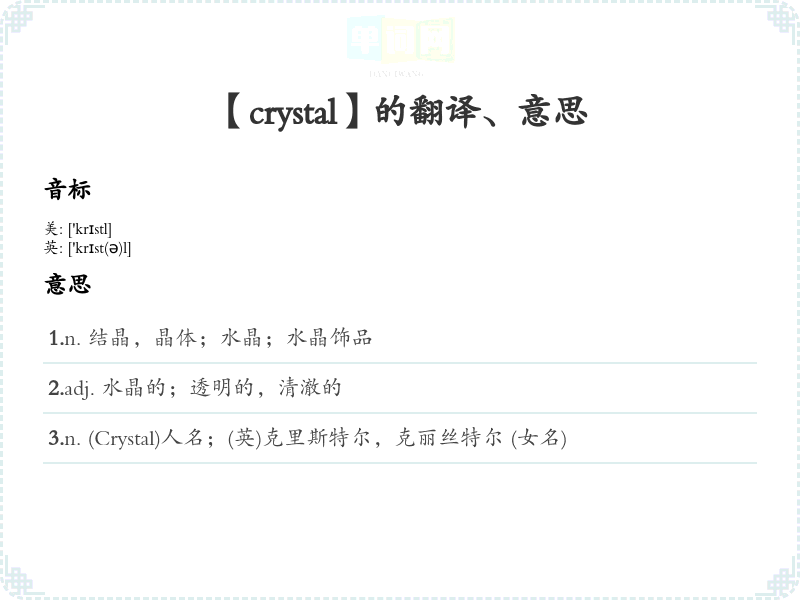 2.adj. 水晶的;透明的,清澈的 3.n. (Crystal)人名;(英)克里斯特尔,克丽丝特尔 (女名)