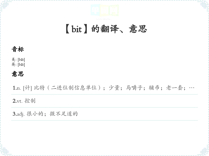 - “bit”源自古英语“bitta”,意为“小块”或“片段”。它与现代词“bite”(咬)有相同的词根,表示“咬”的动作。