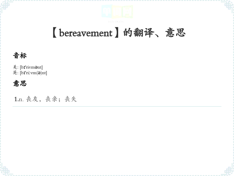 - 谐音联想记忆:将“bereavement”与“悲(bei)”和“离(li)”相结合,联想成“悲伤的离去”。