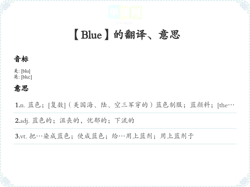 - 字面意思:Blue是一个形容词,通常表示颜色蓝色。字面上它指的是天空或海洋的颜色,通常与平静、冰冷或忧郁的情感联系在一起。