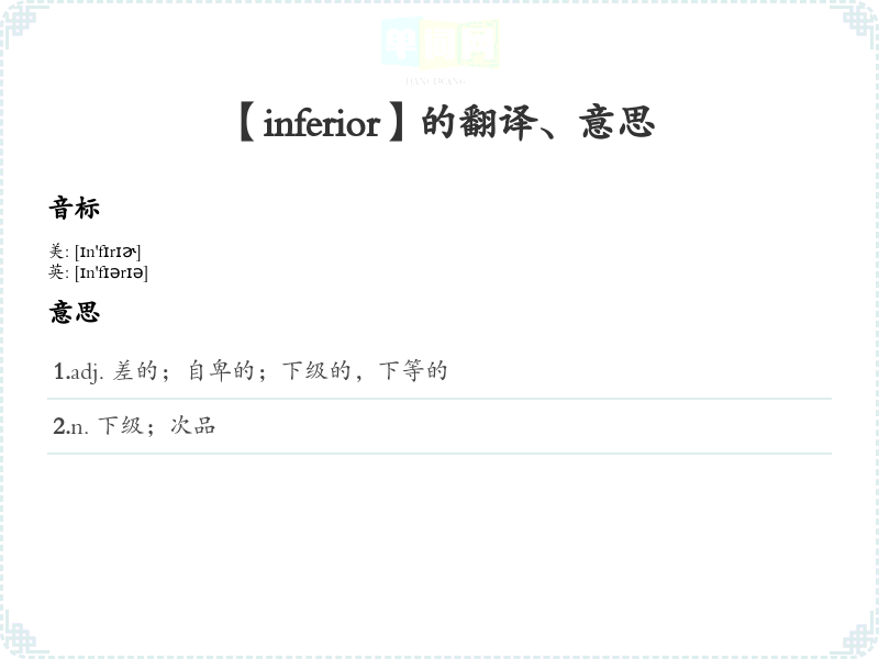 - 词根记忆法:了解词根 "fer" 意为“带来”,将其与 "inferior" 结合,帮助记忆其含义为“带来的低下状态”。
