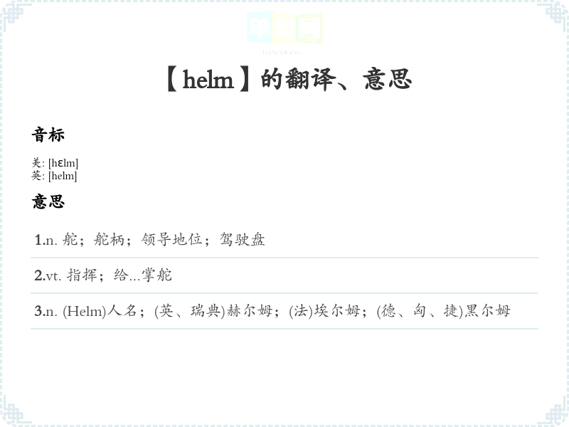 2.vt. 指挥;给...掌舵 3.n. (Helm)人名;(英、瑞典)赫尔姆;(法)埃尔姆;(德、匈、捷)黑尔姆