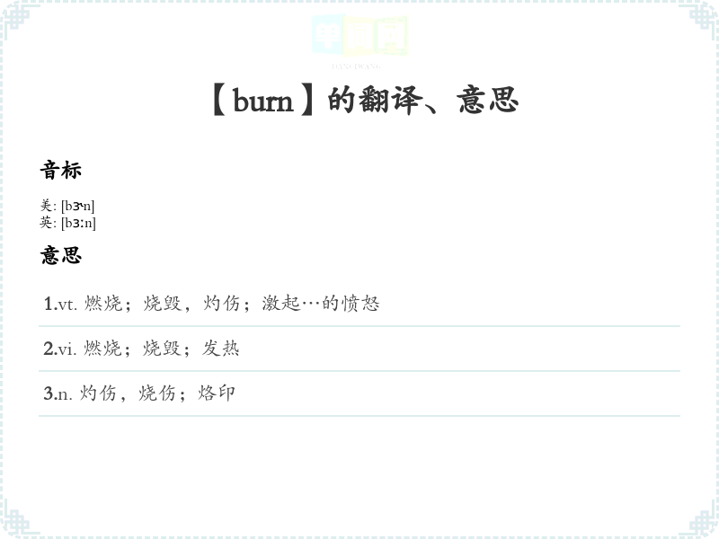 - 通过将burn与其音标的发音相联系,进行重复练*。例如,重复“burn”时,联想其与“火焰”相关的形象,帮助记忆。
