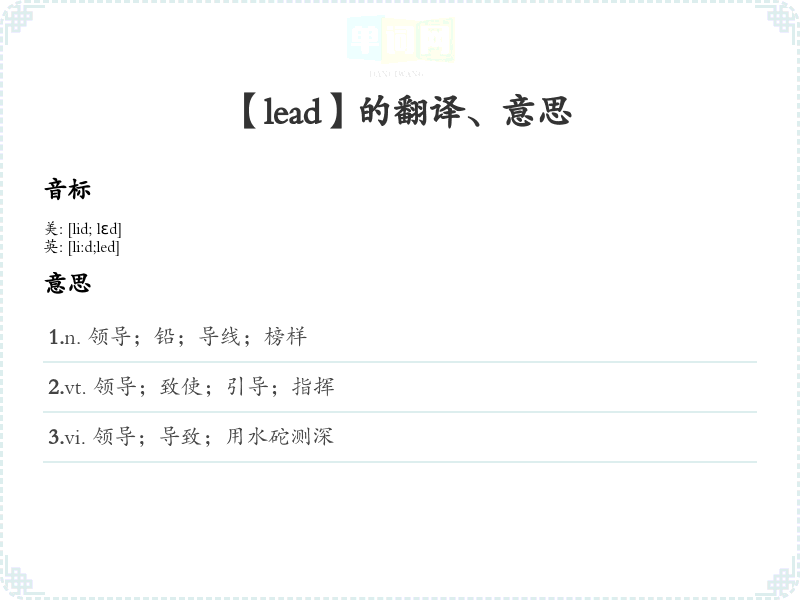 - Lead的音标为/liːd/,可以通过发音练*来加强记忆。