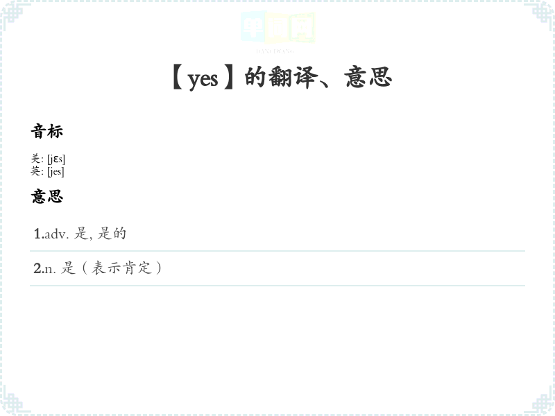 - 音标记忆法:通过音标发音 /jɛs/ 来记忆,可以多次重复练*,帮助记忆发音。