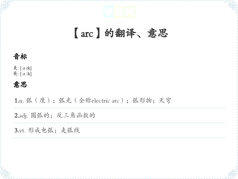- 可通过音标/ɑrk/来记忆arc。可以将其发音与“弧形”(hu xing)联系起来,帮助记忆。