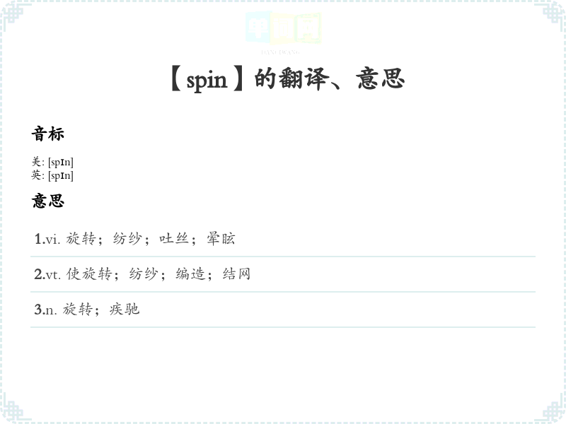 - 音标记忆法:记住 spin 的发音 /spɪn/,可以联想“spin”与“spinach”(菠菜)的发音相似,从而帮助记忆。