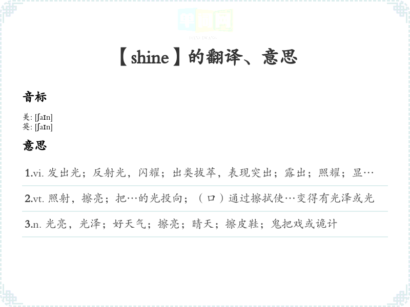 "Shine" 的字面含义是发光、照耀。它通常用于描述光的产生或反射。 - 词性: