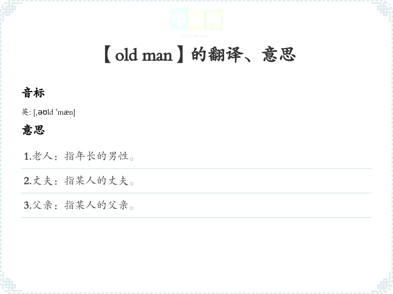- 字面意思:字面上,“old man”指的是一位年长的男性,通常暗示有智慧和经验的**。清晰定义为:一个年纪较大的男性,通常被视为有智慧或权威的人。