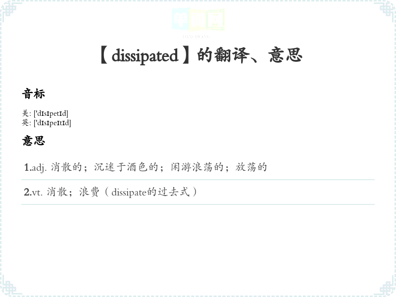 - 谐音联想记忆:联想“dissipated”与“消散”的发音近似,可以帮助记忆其含义。