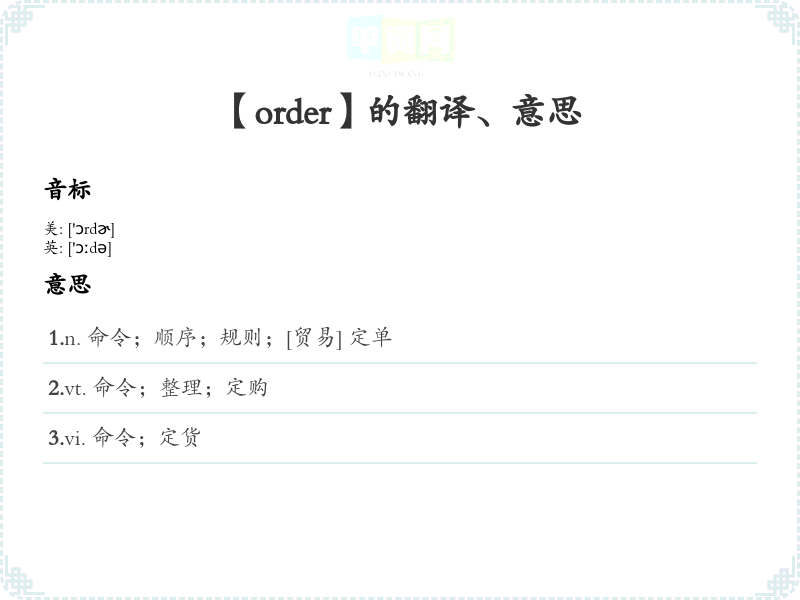 以上是对单词“order”的全面分析,希望能帮助您更好地理解和记忆这个词汇。