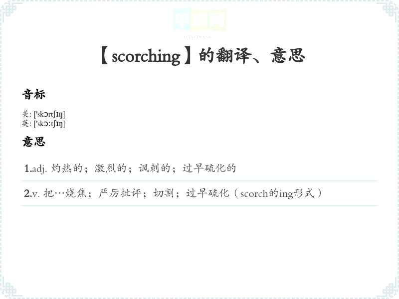 - 音标记忆法:/ˈskɔːrtʃɪŋ/,将其拆分为“scorch”和“ing”来帮助记忆发音。